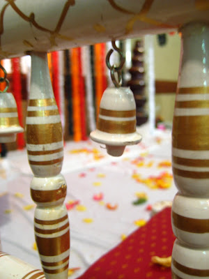 sisters and cousins where the groom awaits in the Mandap.Mandap is usually in the form of a canopy and is beautifully decorated with flowers, colorful personal adornment, and other items.In the mandap, the bride, the groom the parents of the bride and the priest sit, while the rest of the family members sit around the canopy.